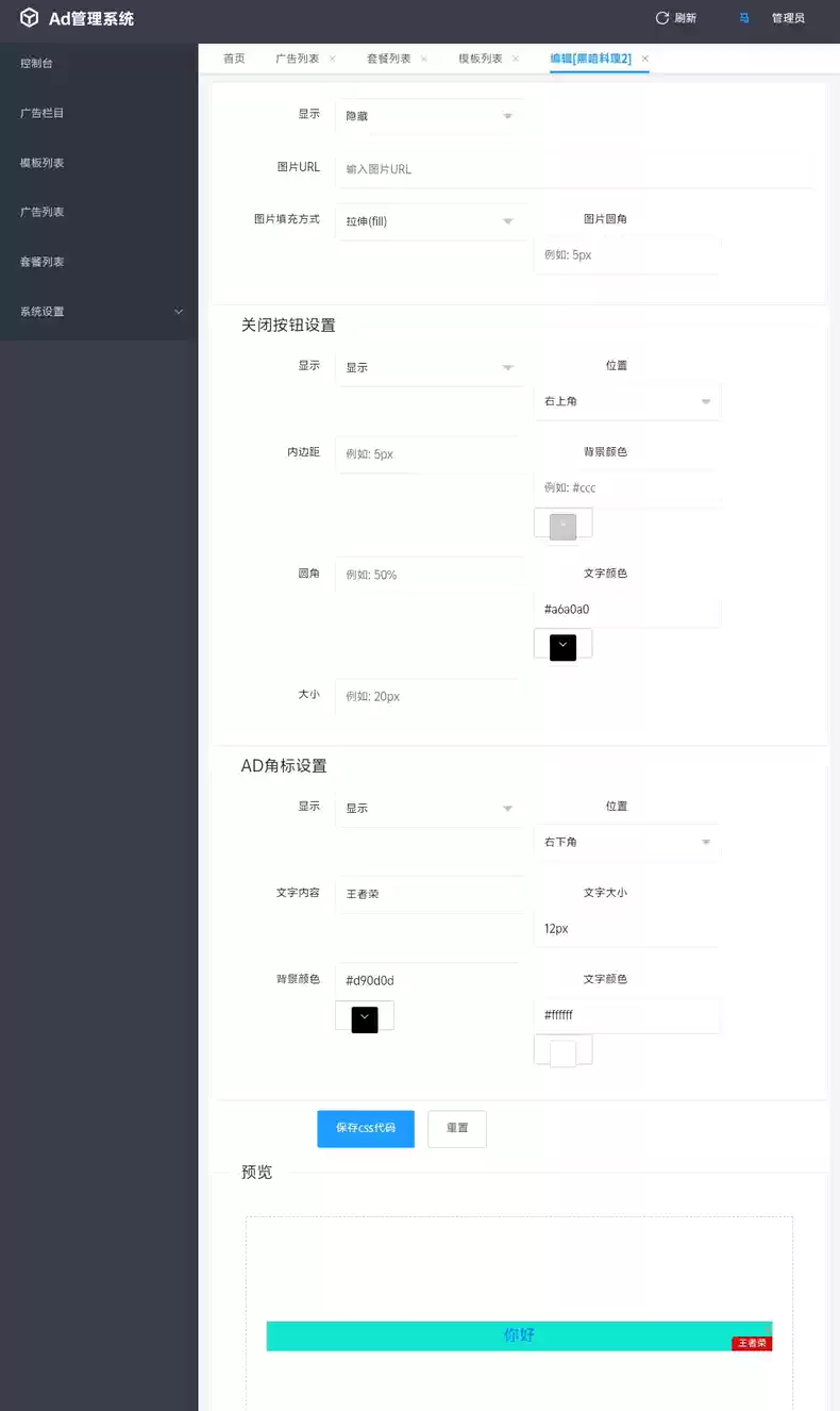 多个广告位置,独立广告位置价格套餐。广告模板在线编辑,一键增加广告位,一键生成安装代码。